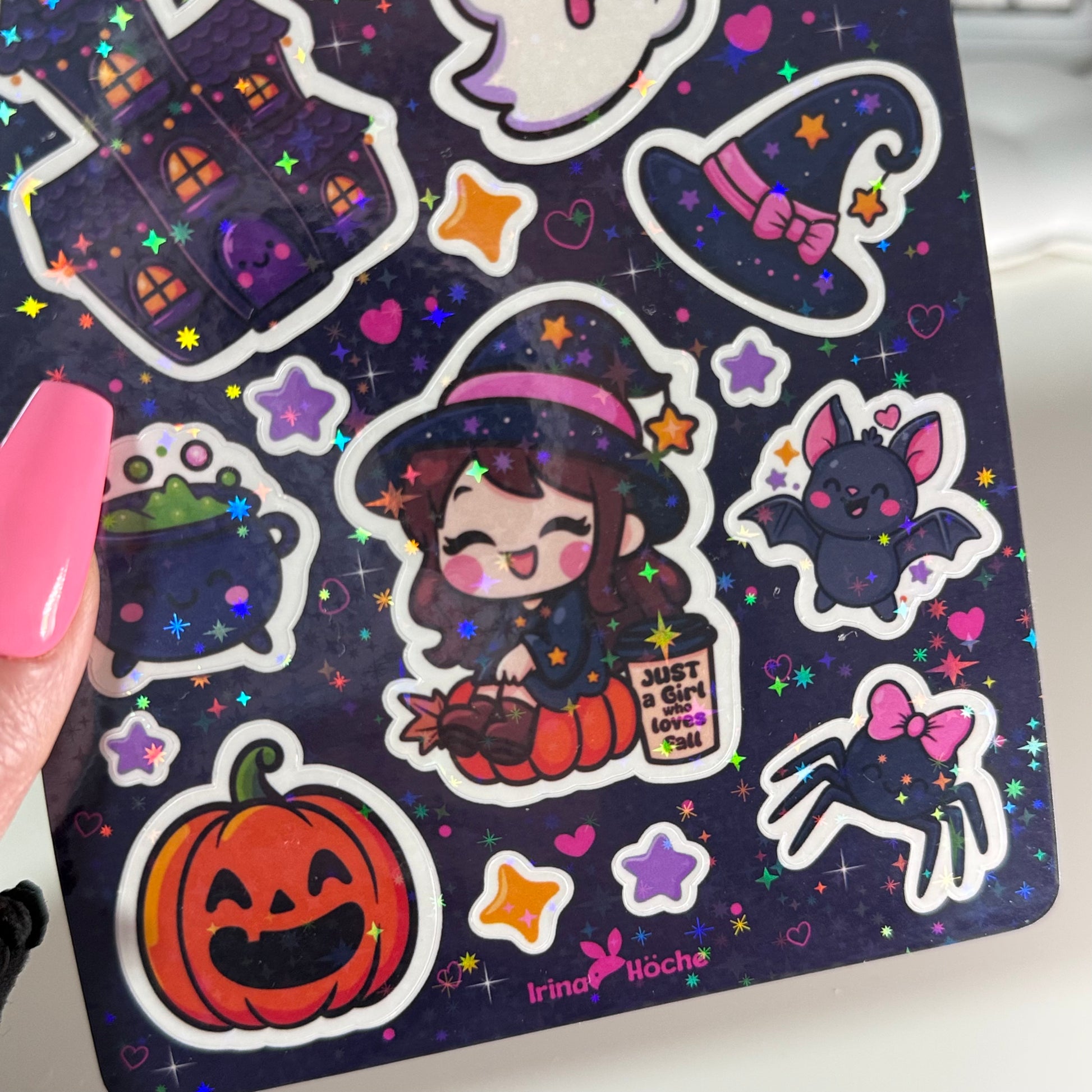 Mach dein Halloween extra spooky & süß! 🎃✨ Dieses Sticker Sheet voller handgezeichneter Motive ist holografisch laminiert, wasserfest und perfekt für Bullet Journals, Scrapbooking, Laptops oder Trinkflaschen.