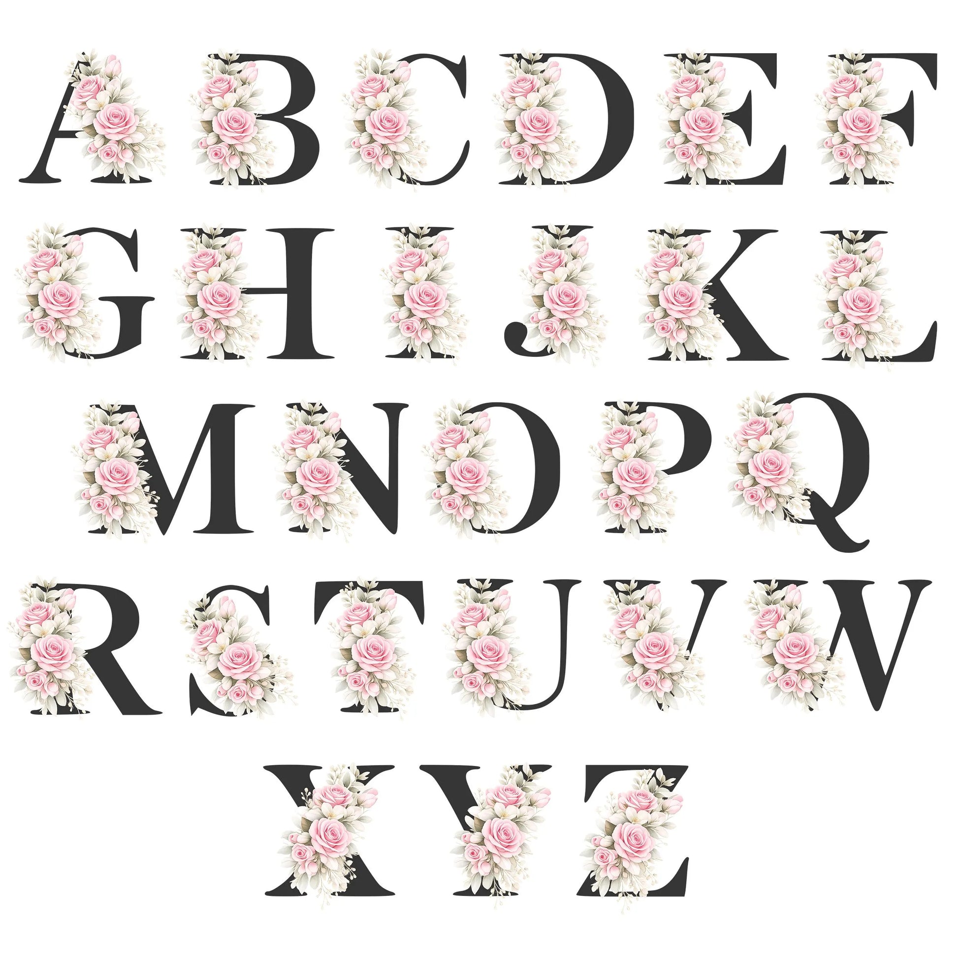 Große schwarze Initiale, kombiniert mit zarten rosa Aquarell-Rosen und feinem Namensschriftzug – feminin, elegant und zeitlos.